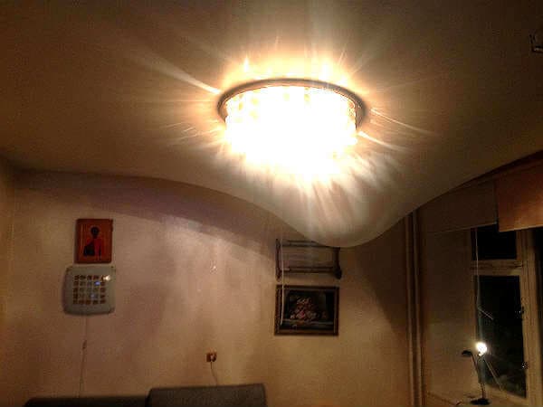 Снимаем люстру или светильник, находящийся максимально близко к пузырю. Иногда создаются цельные потолки с боковым освещением. В этом случае под снимается полотно натяжного потолка для слива жидкости.